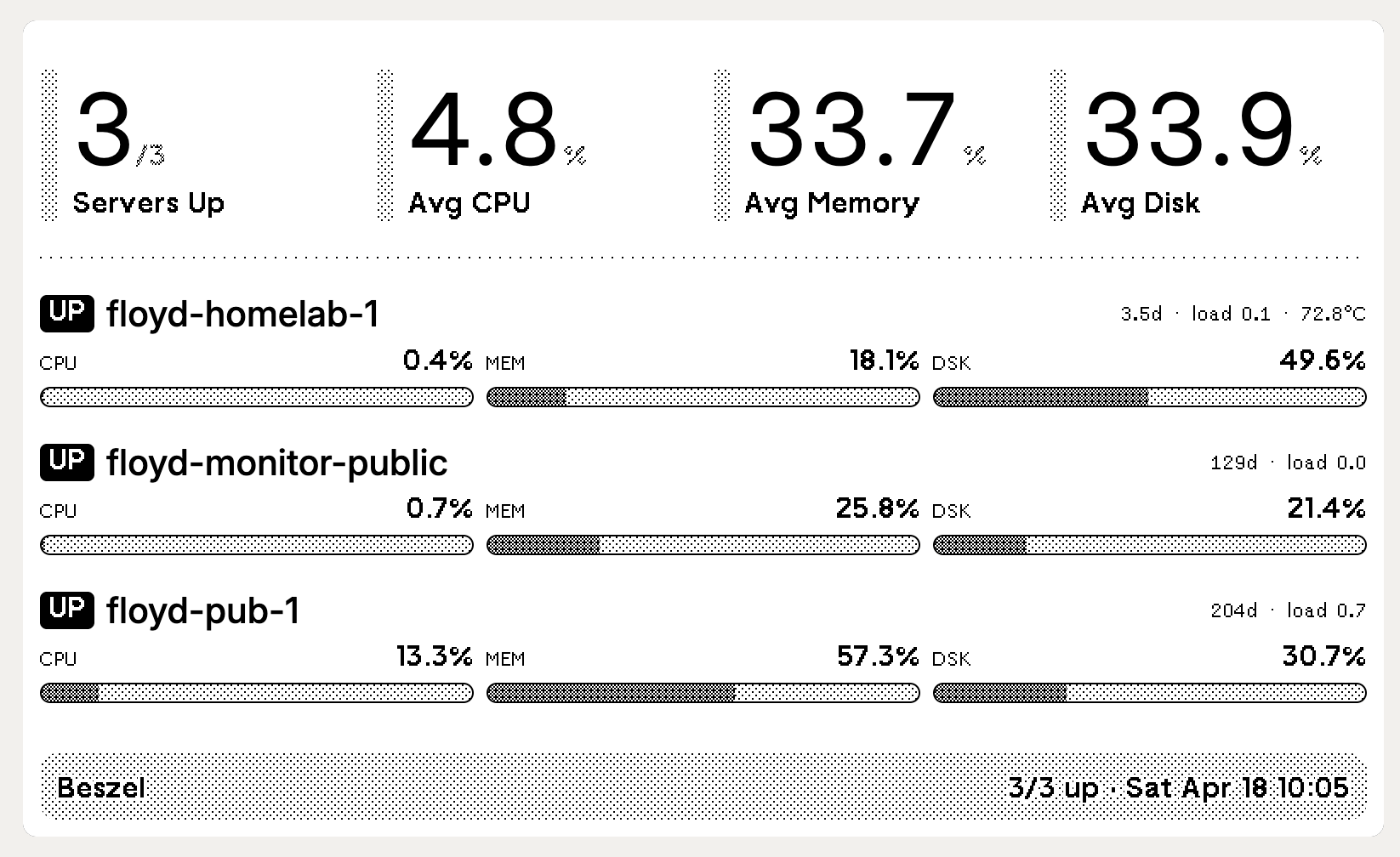 A TRMNL e-ink plugin that shows your Beszel server fleet at a glance — CPU, memory, disk, uptime, load average, and temperature for every host you monitor.